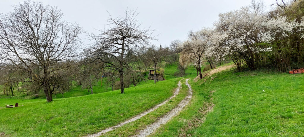 Danach geht es durch Wald und Streuobstwiesen hoch zum