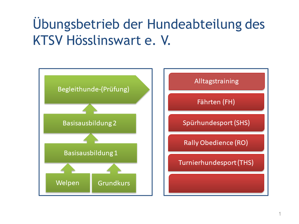 Den Übungsbetrieb der Hundeabteilung im KTSV haben wir in zwei Säulen organisiert. Eine Säule befasst sich mit dem Thema Ausbildung. Die zweite Säule beinhaltet verschiedene Themenbereiche, die eine dauerhafte Beschäftigung und Auslastung der Hunde gewährleisten soll. Aber denkt immer daran – wir können nur Hundeführern Anregungen und Hinweise geben und euch mit Übungen im Training an Ausbildungsthemen heranführen. Die eigentliche Arbeit, diese mit und bei euren Hunden anzuwenden, liegt immer beim Hundeführer, also bei euch selbst.